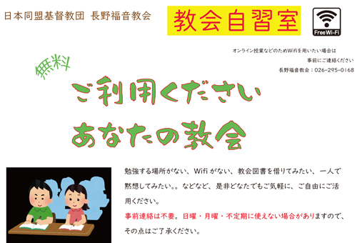 ■お知らせ~当教会と地域伝道のために十年以上にわたってお働きくださいました高橋宣広牧師は、2022年3月をもって「福井中央キリスト教会」(福井県福井市)へ転任となりました |